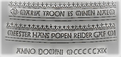 Another bell with continental associations and an even stranger tale stands in the kirkyard of Kettins. The bell has the inscription: 'My name is Marie Troon and Mr Hans Popenuyder [Popen Reider] made me in 1519.' This Hans is possibly to be identified with the cannon-maker who supplied the cannons for Henry VIII's warship the Mary Rose. There is no proven connection between this foreigner with Kettins (or the Flemish monastery mentioned below).