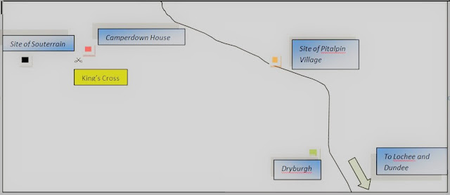 It is probably worth pointing out that the name Pitalpin originally attached to a small settlement on the Lochee/Dundee to Newtyle road, some distance north of the present Pitalpin street names to the west of Lochee (which would be to the south-east of Dryburgh marked on the map below. King's Cross Road in Lochee is similarly some distance away from the King's Cross stone.). The CANMORE website shows the location of the original Pitalpin near the current Telford Road in Dryburgh Industrial Estate, Dundee.